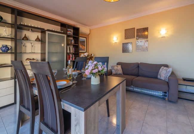 С самого входа открывается уютное жилое пространство, где гостиная и оборудованная кухня выходят на приятную террасу, идеально подходящую для завтраков на свежем воздухе. В спальной зоне квартира предлагает одну спальню с двуспальной кроватью, вторую спальню с двумя односпальными кроватями и ванную комнату с душем и туалетом.